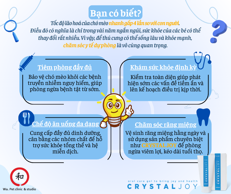 CHÓ MÈO GIÀ ĐI NHANH GẤP 4 LẦN SO VỚI CON NGƯỜI 1. Bạn có biết? Chó mèo lão hoá nhanh gấp khoảng 4 lần so với con người. Điều đó có nghĩa là chỉ trong vài năm ngắn ngủi, sức khỏe của các bé có thể thay đổi rất nhiều. Chăm sóc y tế dự…